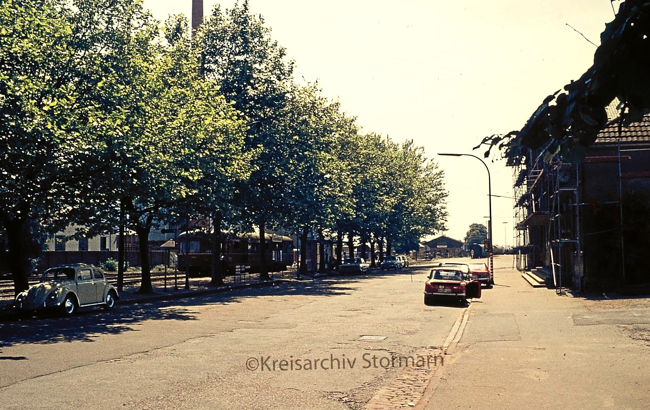 Achern Bahnhof 1972 Triebwagen VW Käfer Baumallee