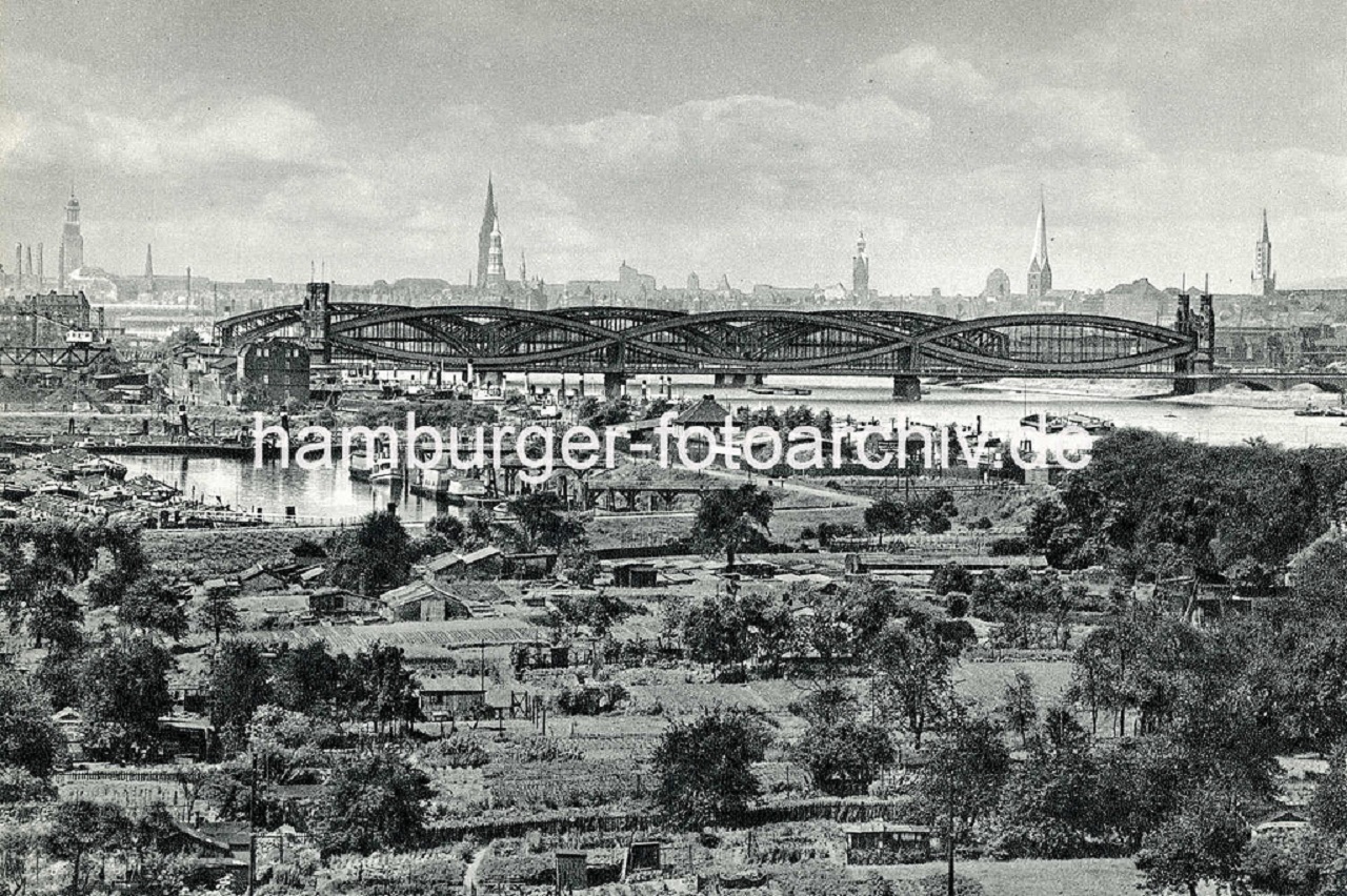 1950 Norderelbe Veddel Kleingärten Elbufer Hafenbecken Peutehafen Elbrücken Panorama Hamburg