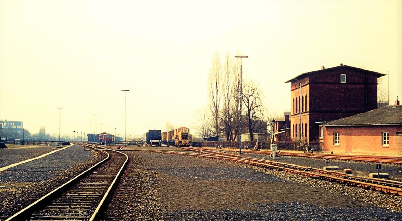 Bahnhof Bad Oldesloe 1975 Schleifzug Gleiszug Bahn Bautrupp gelb (1)
