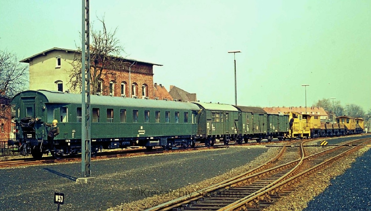 Bahnhof Bad Oldesloe 1975 Schleifzug Gleiszug Bahn Bautrupp gelb (3)